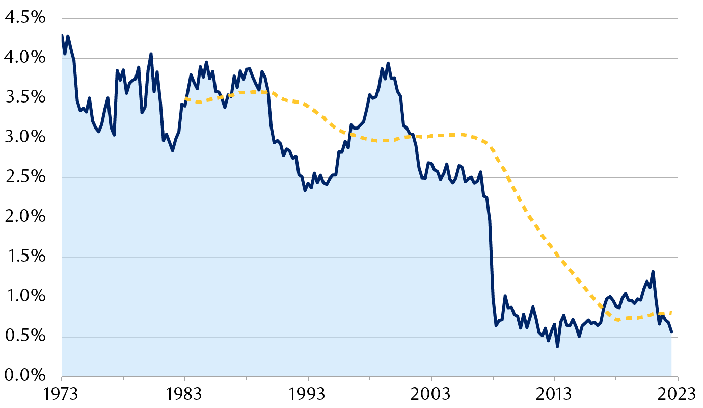 The line chart shows a model estimate of the so-called “natural” interest rate quarterly from December 1973 through June 2023, and the rolling 10-year average since 1983. The natural interest rate declined sharply after the global financial crisis in 2008; the 10-year rolling average fell from roughly 3% in 2008 to less than 1% in 2019. The natural rate currently remains far below its level before the financial crisis, with the model estimate around 0.5%.