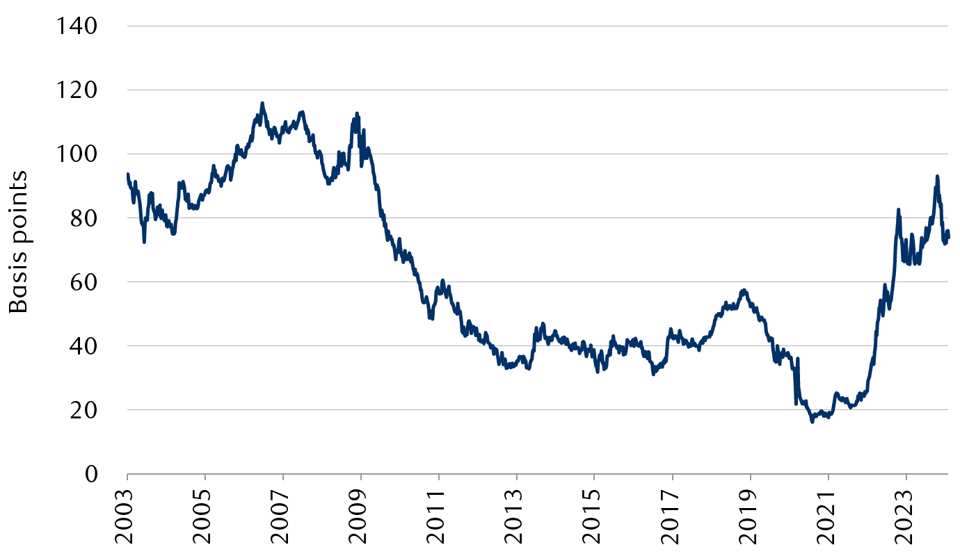 Line chart showing the yield to duration ratio for the U.S. Aggregate Investment Grade Bond Index from 2003 to January 2024. This ratio represents the upward change in yields (downward move in bond prices) required over the next 12 months for the bond index to generate a forward 12-month return of 0.0%. This allows fixed income investors to appropriately assess the potential downside that could be realized if bond yields rise. In March 2022, we estimated that U.S. investment-grade debt markets only had a 20-30 basis point (bp) shock absorber. Today, because of higher interest rates, inflation, and shifting term premiums, investment-grade debt markets have developed an 85-100 bp buffer, in our assessment.