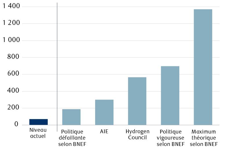 Nota : Les scénarios « Politique défaillante » et « Politique vigoureuse » selon BNEF dépendront de la vigueur et du degré de coordination des politiques gouvernementales de décarbonisation et de promotion de l’hydrogène. Le « Maximum théorique » selon BNEF dépend de la vigueur des politiques ainsi que de l’adoption de l’hydrogène par les secteurs de l’économie peu susceptibles de passer à l’électrification. Les prévisions de l’AIE correspondent à son scénario de développement durable, lequel est fondé sur les objectifs de l’Accord de Paris sur le climat. L’Hydrogen Council est un regroupement sectoriel de plus d’une centaine d’entreprises qui souhaite accélérer le déploiement de l’hydrogène dans le but de favoriser la transition vers une énergie propre.